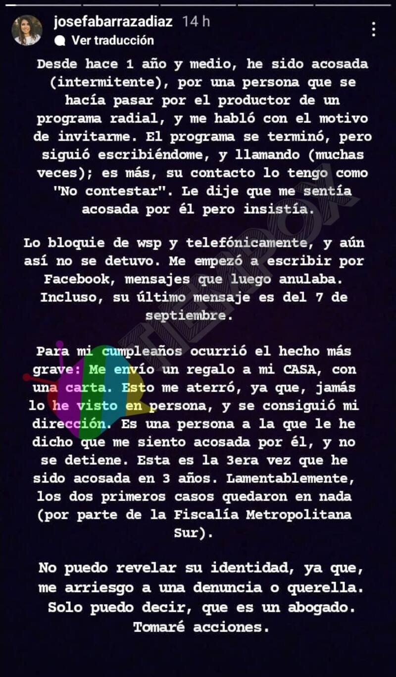 "Desde hace 1 año y medio, he sido acosada (intermitente), por una persona que se hacía pasar por el productor de un programa radial, y me habló con el motivo de invitarme. El programa se terminó, pero siguió escribiéndome, y llamando (muchas veces); es más, su contacto lo tengo como 'No contestar'. Le dije que me sentía acosada por él, pero insistía", comenzó relatando la comunicadora.
