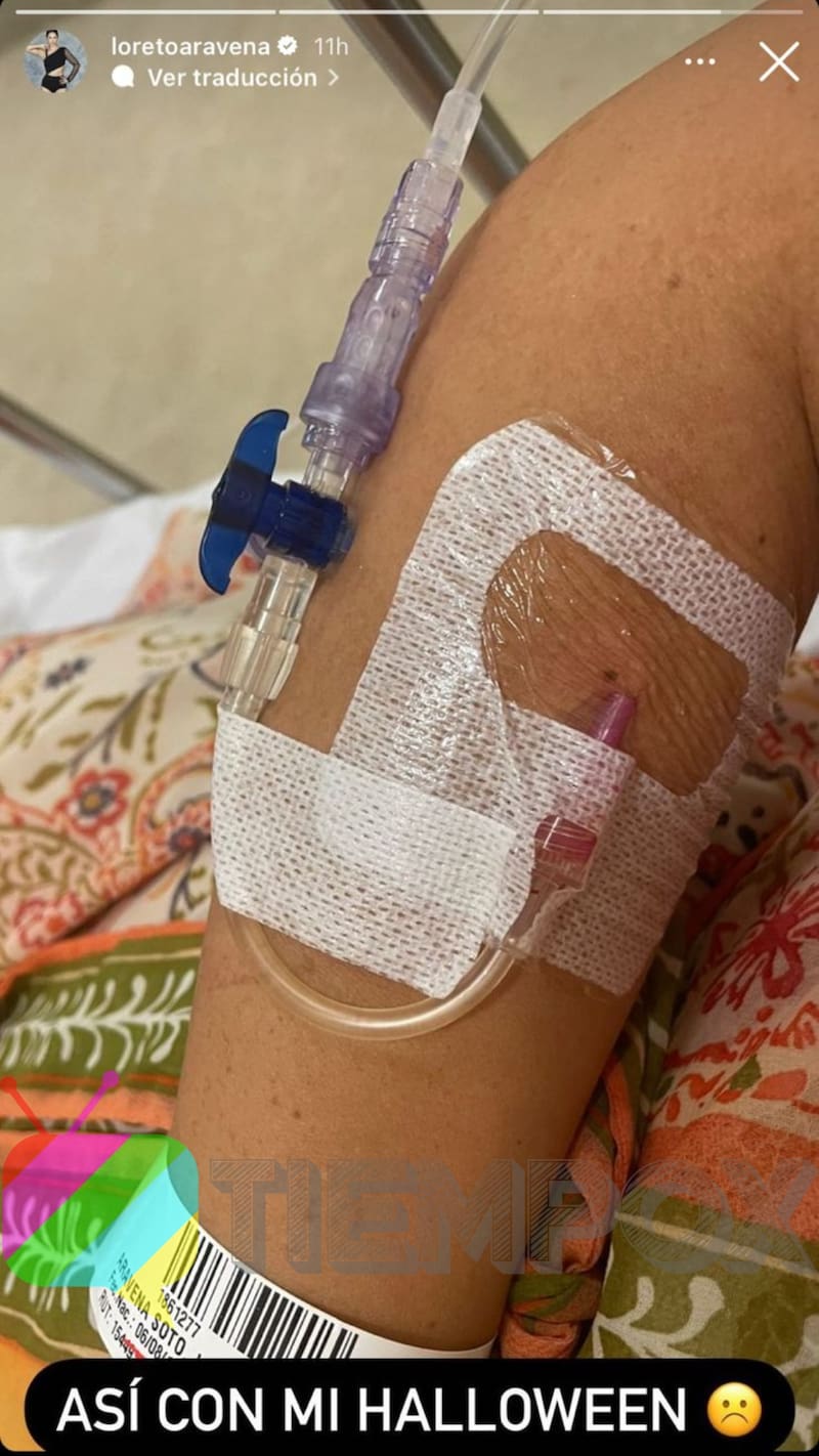 Si bien, Loreto Aravena no entró en mayores detalles sobre la enfermedad que la aquejó, se cree que se debe a la picadura de una araña que sufrió hace un día. "Así con mi Halloween", escribió la actriz, junto al registro donde se puede apreciar que está siendo inyectada con algún medicamento.
