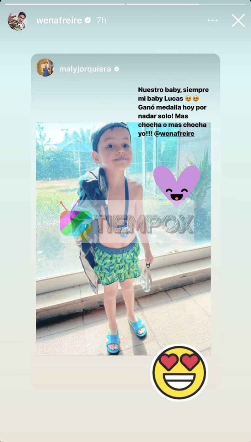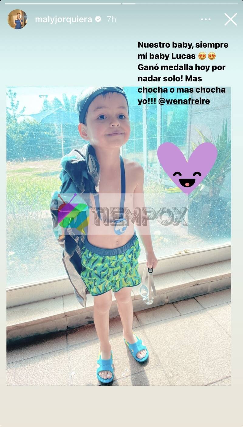 "Nuestro baby, siempre mi baby Lucas, ganó medalla hoy por nadar solo. ¡Más chocha o más chocha yo!", escribió Maly Jorquiera en su cuenta de Instagram, junto a una fotografía del pequeño en traje de baño. De inmediato, Sergio Freire compartió el mismo post y agregó un emoji de enamorado.
