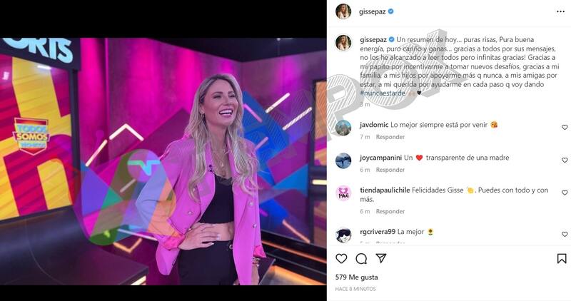 "A mis amigas por estar y a mis queridas por ayudarme en cada paso que voy dando. Nunca es tarde", cerró Gissella Gallardo, agregando una fotografía de su participación en "Todos Somos Técnicos", donde comparte espacio con Manuel de Tezanos, Aldo Schiappacasse y otros profesionales.