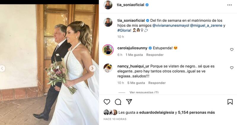 Fue el pasado 19 de noviembre que Natalia Zerené, hija de Viviana Nunes, contrajo matrimonio con Francis Antoine David, luciendo un hermoso vestido que encantó a todos. Poco a poco han ido exhibiéndose más postales de la ceremonia y, en esta ocasión, Sonia Fried, conocida también como la tía Sonia, invitada a la boda, compartió una bella imagen del momento.