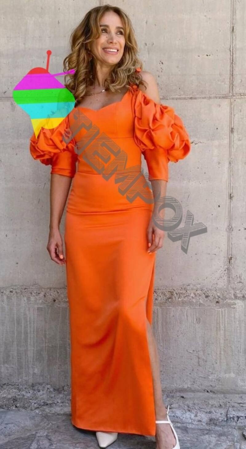 La matriarca de la familia utilizó un largo vestido anaranjado, el cual tenía unas mangas cortas al estilo bombachas, y al que decidió acompañar con un bolso del mismo color y unos elegantes zapatos de tacón blancos.