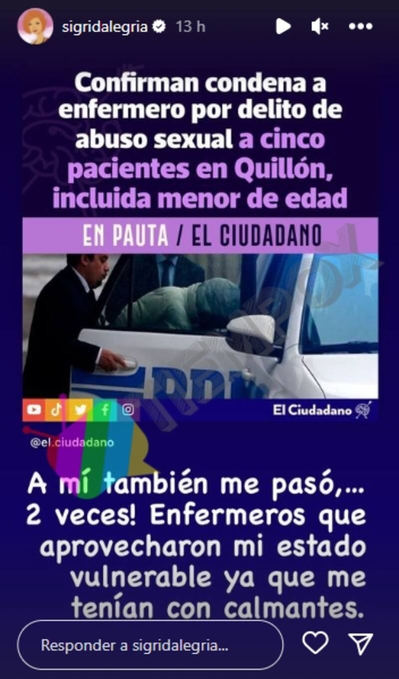 Sigrid Alegría desbloqueó un traumático recuerdo a través de su cuenta de Instagram, luego de compartir una grave noticia policial, y es que señaló haber sido víctima de una insólita forma de abuso.