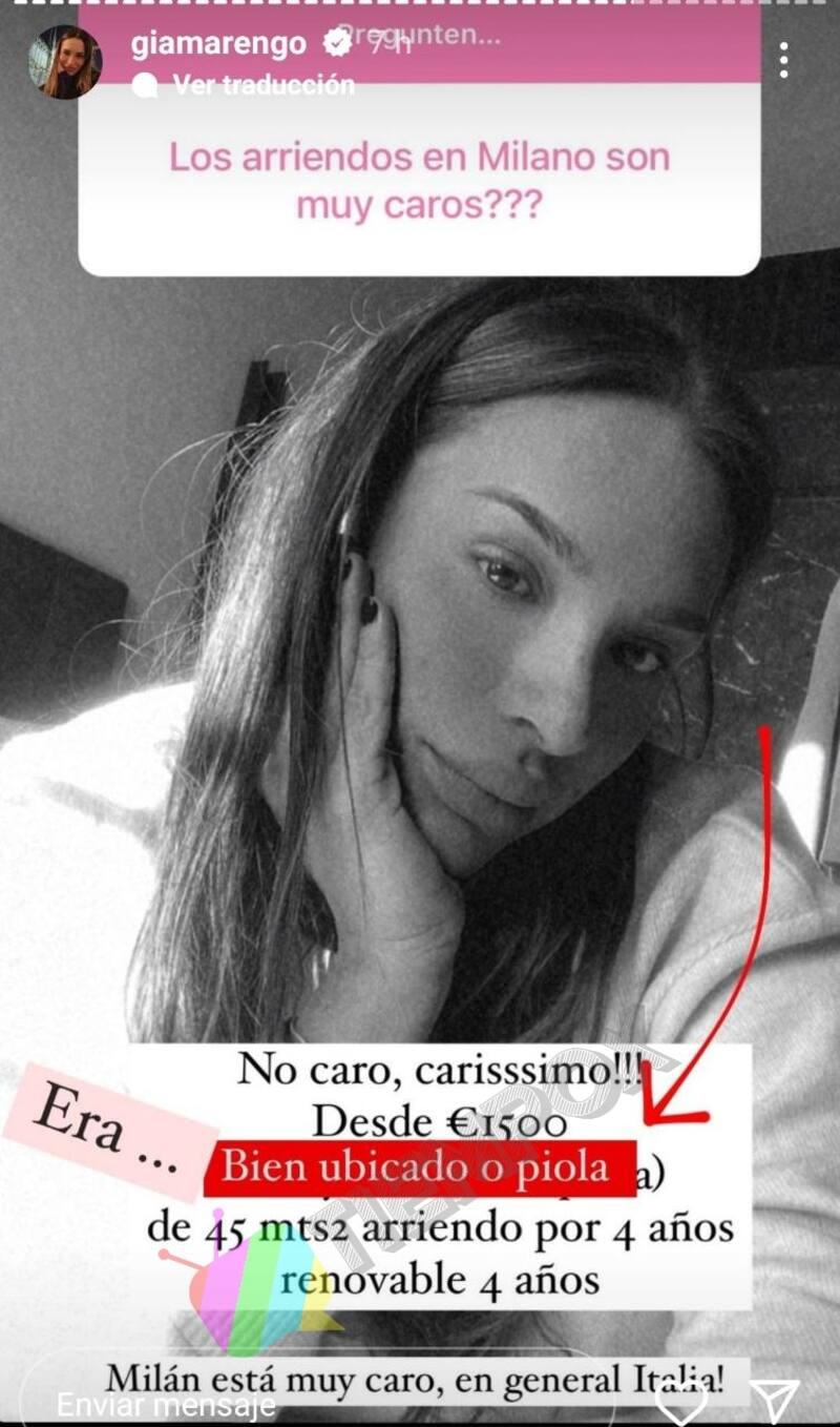 "Desde 1.500 euros, bien ubicado o piola. Son espacios de 45 metros cuadrados, arriendo por cuatro años y renovable por cuatro años más. Milán está muy caro, Italia en general lo está", reveló Gianella Marengo en el formato historias.