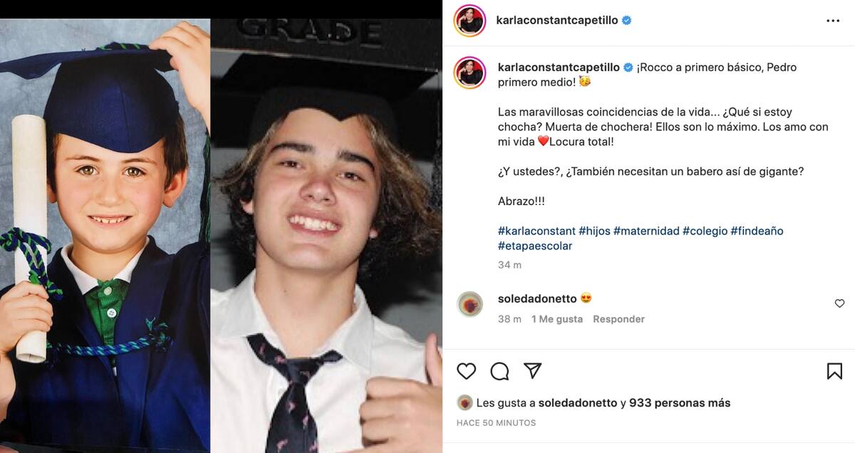 "¡Rocco a primero básico, Pedro primero medio!", celebró Karla Constant junto a la publicación dedicada a sus dos retoños, quienes tienen 6 y 14 años, respectivamente.