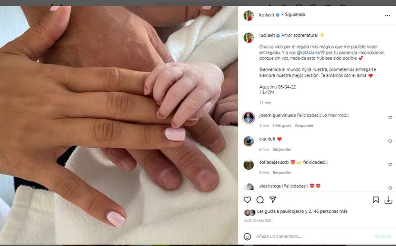 "Bienvenida al mundo hijita nuestra, prometemos entregarte siempre nuestra mejor versión. Te amamos con el alma", escribió Lucila Vit en la postal subida a Instagram. De inmediato, se llenó de mensajes de cariño para ella, su bebé y Rafael Olarra.