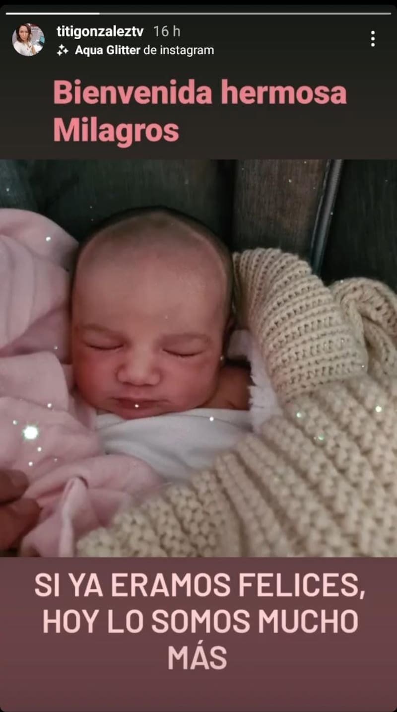 "Si ya éramos felices, ho lo somos mucho más", dijo Cristina González en sus redes sociales, revelando que su retoña lleva por nombre Milagros.