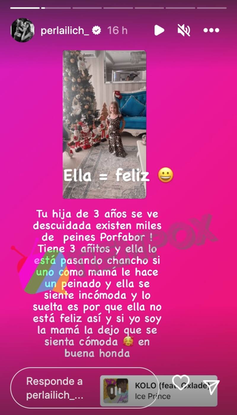 "'Tu hija de tres años se ve descuidada', 'existen miles de peines'", partió diciendo Perla Ilich por los comentarios que recibió, exclamando: "¡Por favor! Tiene tres añitos y ella lo está pasando chancho".