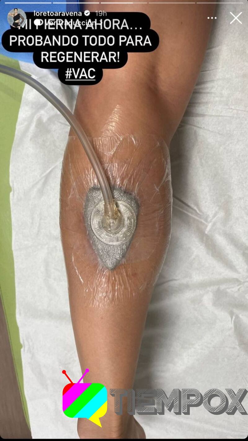 Actualmente, han pasado casi dos meses del accidente y Loreto Aravena aprovechó de evidenciar el novedoso procedimiento que se hizo para mejorar y regenerar el sector donde le quedó la cicatriz. Conforme a lo que se pudo apreciar, ella se tuvo que poner una máquina llamada Vac en su pierna izquierda, la cual contiene un sistema de cierre asistido por vacío en heridas de carácter complejo.
