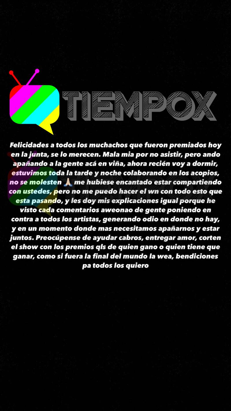 "Y les doy mis explicaciones igual porque he visto cada comentario ahue.. de gente poniendo en contra a todos los artistas, generando odio en donde no hay. Y en un momento donde más necesitamos apañarnos y estar juntos. Preocúpense de ayudar cabros, entregar amor, corten el show con los premios, de quién ganó o quién tiene que ganar, como si fuera el final del mundo la wea, bendiciones para todos, los quiero" finalizó el intérprete de "Caminemos de la mano".