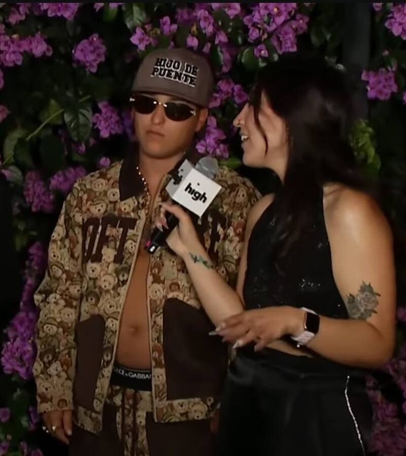 Pablito asistió al evento musical con un look de dos piezas. Su chaqueta la utilizó abierta, por lo que su estomago quedó descubierto. A esta le sumó unos lentes negros y un jockey que hizo contraste con su outfit.