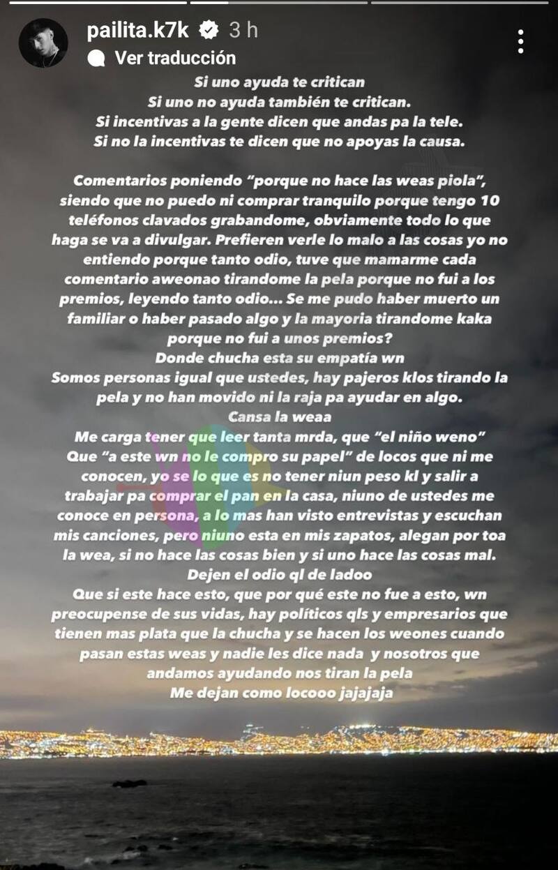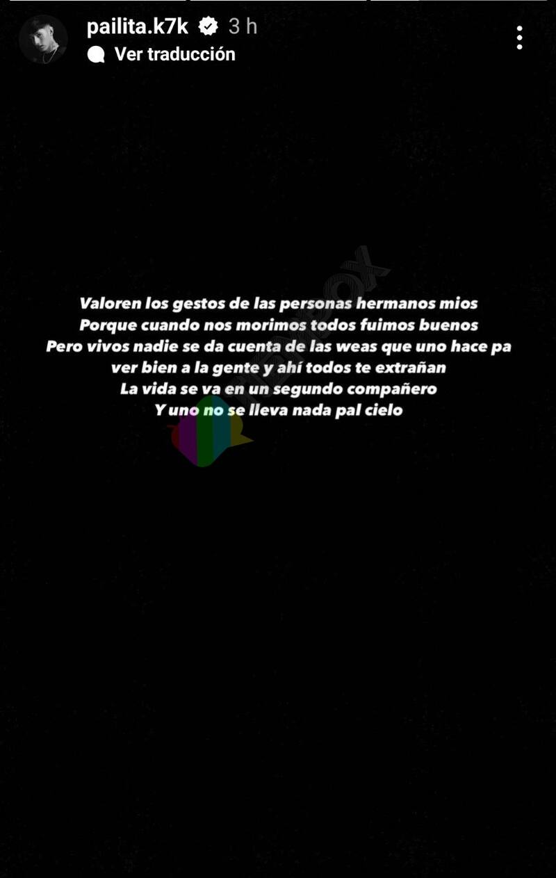 Para finalizar, Pailita redactó una profunda reflexión: "Valoren los gestos de las personas, hermanos míos. Cuando nos morimos todos fuimos buenos, pero vivos nadie se da cuenta de las hue... que uno hace para ver bien a la gente, ahí todos te extrañan. La vida se va en un segundo, compañeros, y uno no se lleva nada para el cielo".