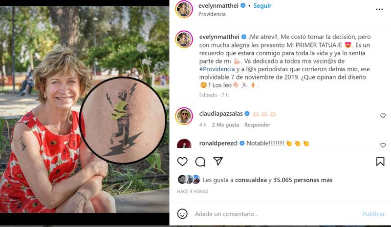 Internet se encendió en llamas cuando Evelyn Matthei anunció que se había realizado un característico tatuaje en su brazo. "¡Me atreví!, Me costó tomar la decisión, pero con mucha alegría les presento mi primer tatuaje. Es un recuerdo que estará conmigo para toda la vida y ya lo sentía parte de mí. Va dedicado a todos mis vecinos de Providencia y a los periodistas que corrieron detrás mío, ese inolvidable 7 de noviembre de 2019. ¿Qué opinan del diseño?", escribió.