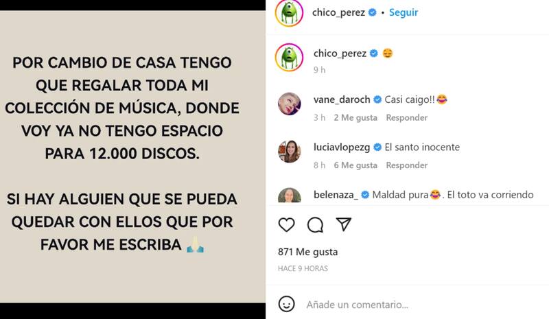 Otro de los rostros que también hizo de las suyas este día fue Cristián "Chico" Pérez quien anunció a través de su Instagram que debido a un cambio de casa, tenía que regalar los 12 mil discos de música que componen su colección. Vanessa Daroch, Belén Mora, Lucía López y Mónica Aguirre fueron algunos de los que cayeron en su chistosa broma.