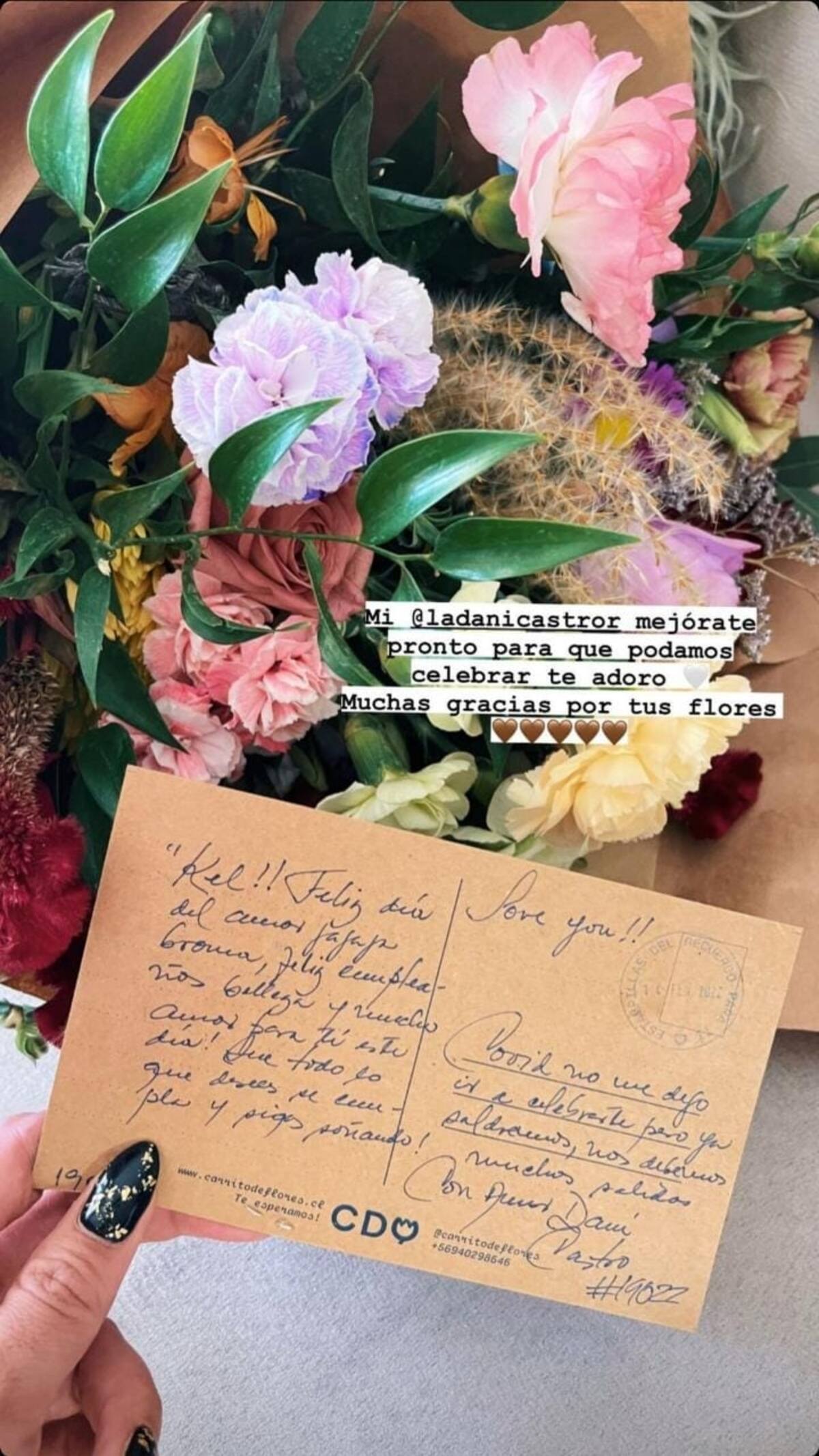"Mi Dani Castro. Mejórate pronto para que podamos celebrar. Te adoro. Muchas gracias por tus flores", indicó la influencer a la exconcursante de "MasterChef".