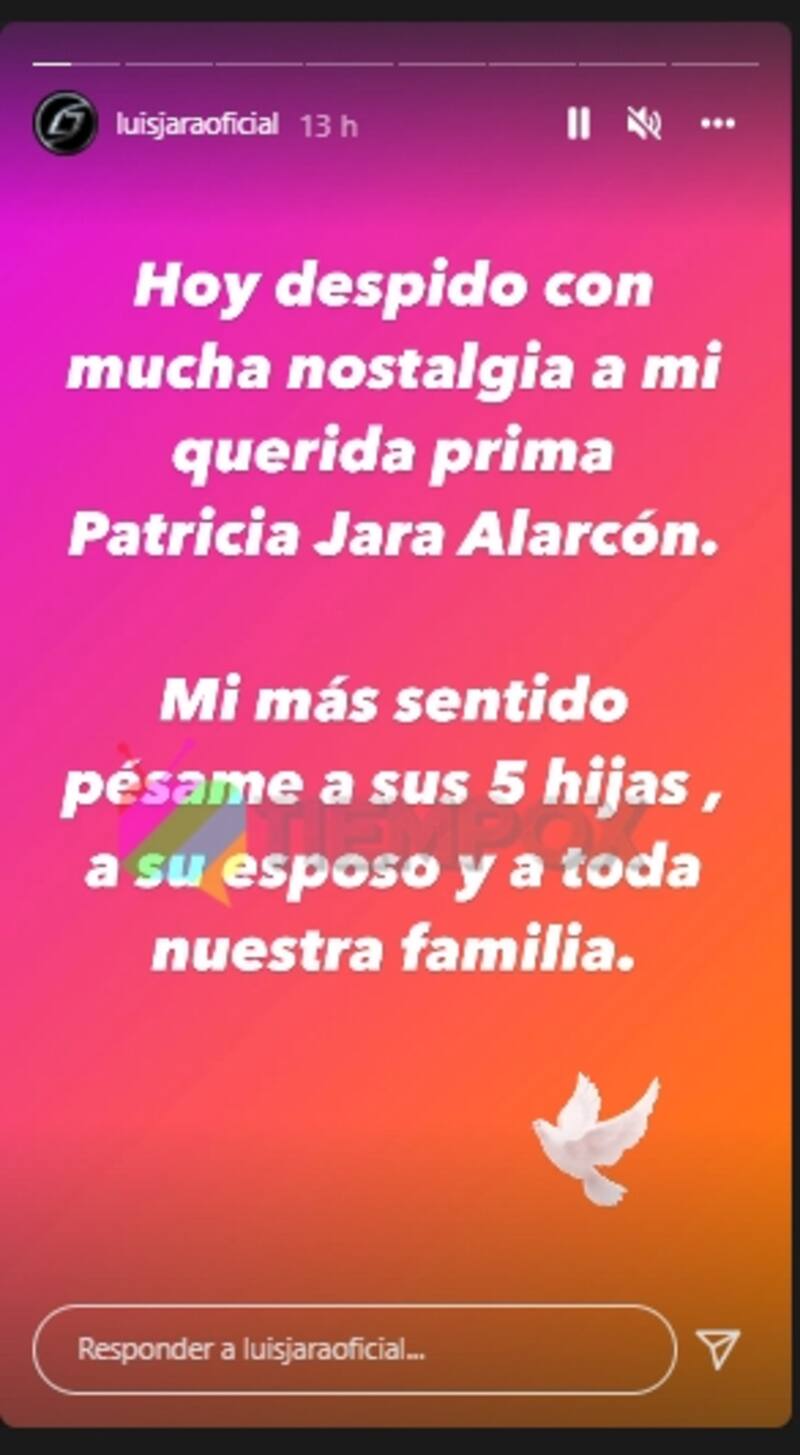 "Hoy despido con mucha nostalgia a mi querida prima, Patricia Jara Alarcón", partió diciendo, agregando "mi más sentido pésame a sus 5 hijas, a su esposo, y a toda nuestra familia".