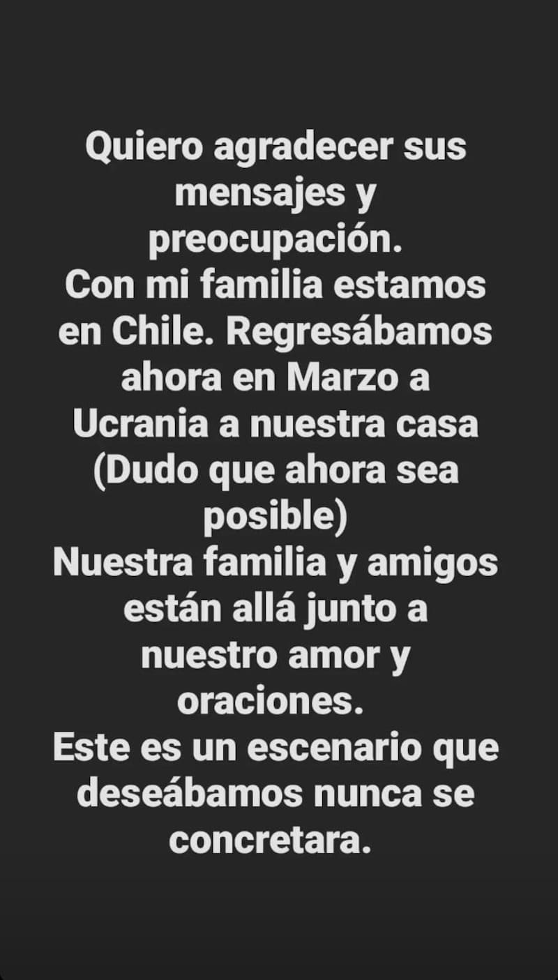 "Quiero agradecer sus mensajes y preocupación. Con mi familia estamos en Chile. Regresábamos en marzo a Ucrania a nuestra casa", explicó la periodista.
