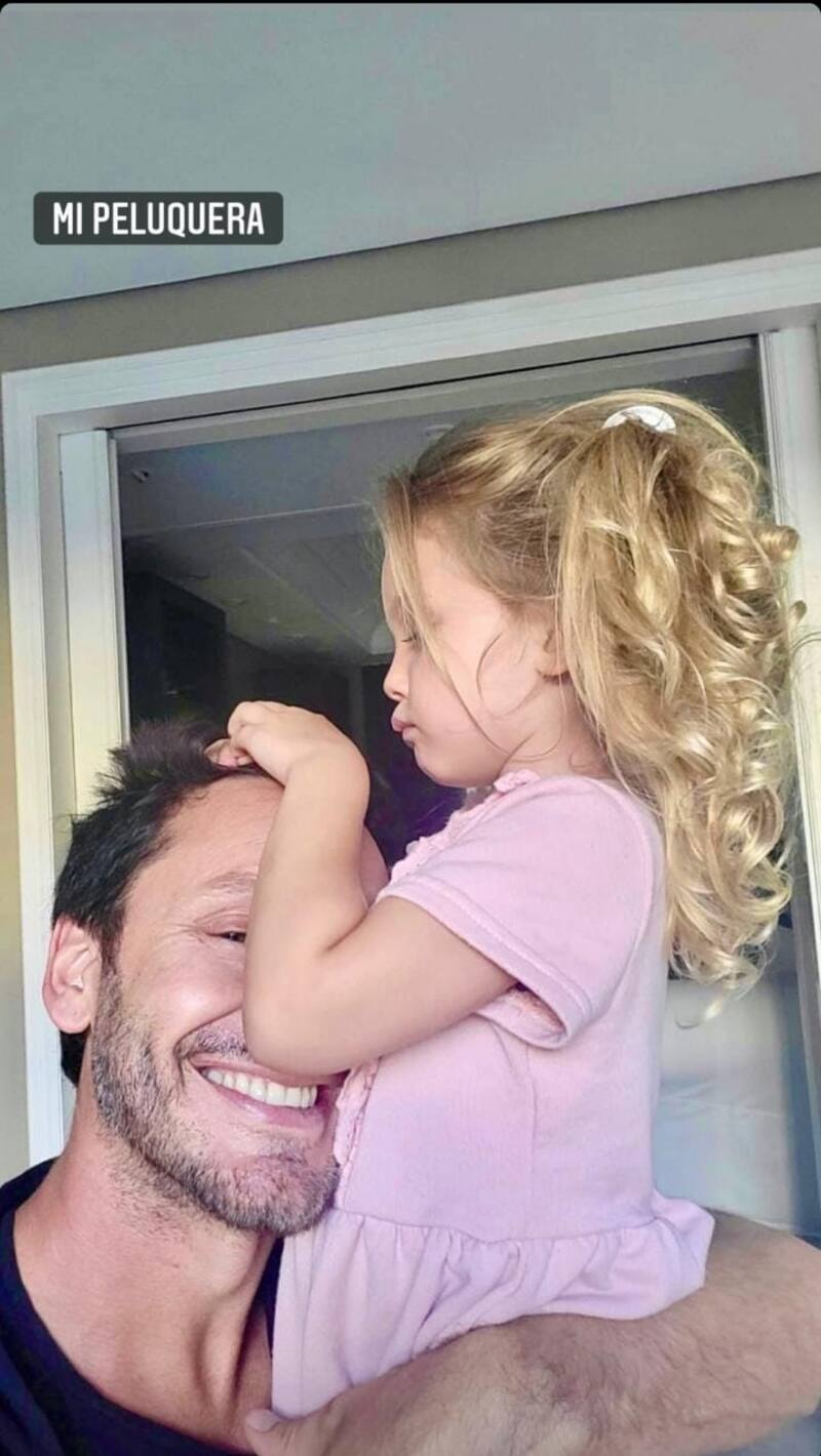 "Mi peluquera", escribió en una historia Benjamín Vicuña, todo esto mientras la menor está tomando su pelo y observando el peinado de su padre.