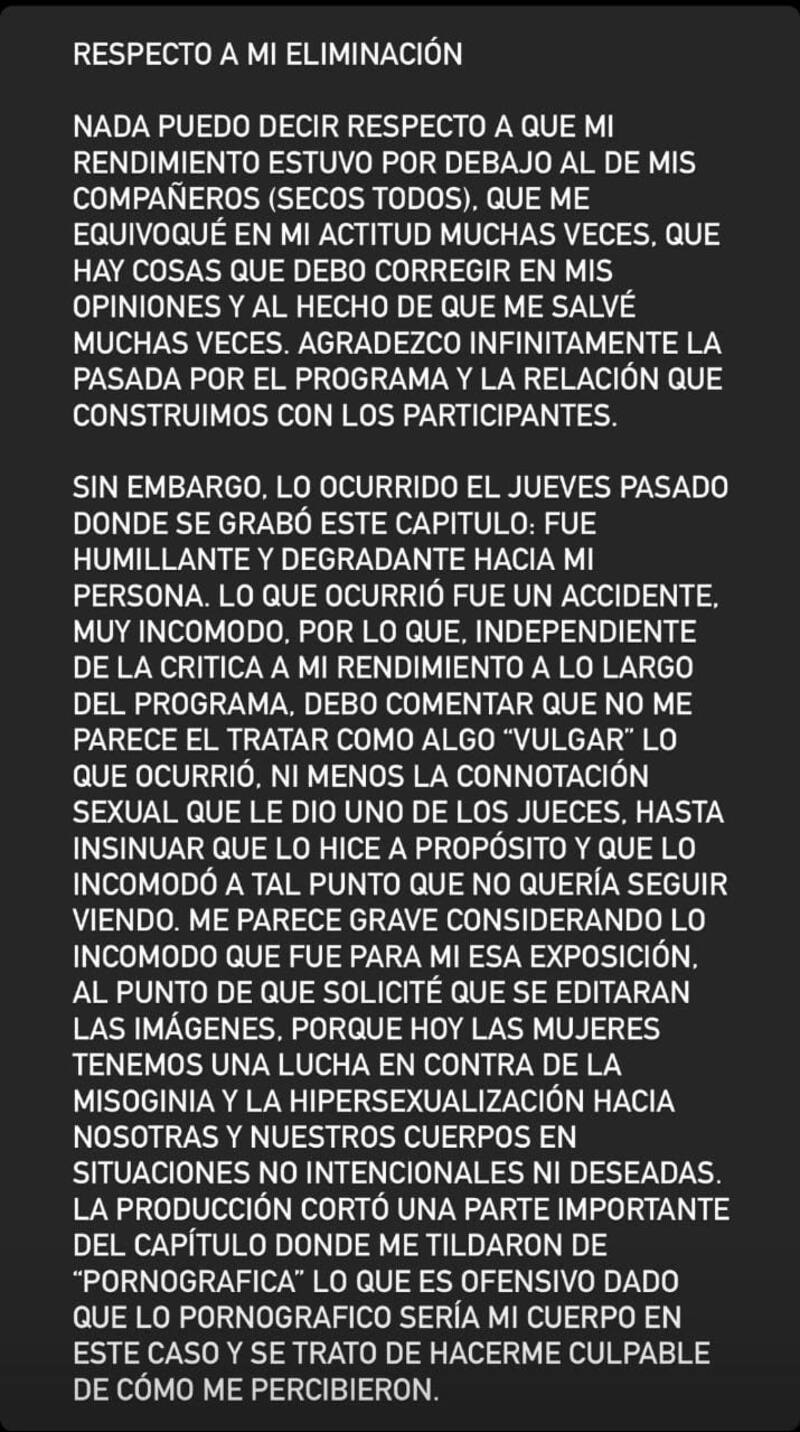 "lo ocurrido el jueves, donde se grabó este capítulo, fue humillante y degradante hacia mi persona. Lo que ocurrió fue un accidente muy incómodo por lo que, independiente de la crítica a mi rendimiento, no me parece el tratar como algo 'vulgar' lo que pasó y menos de connotación 'sexual'", detalló Yasmín Valdés.