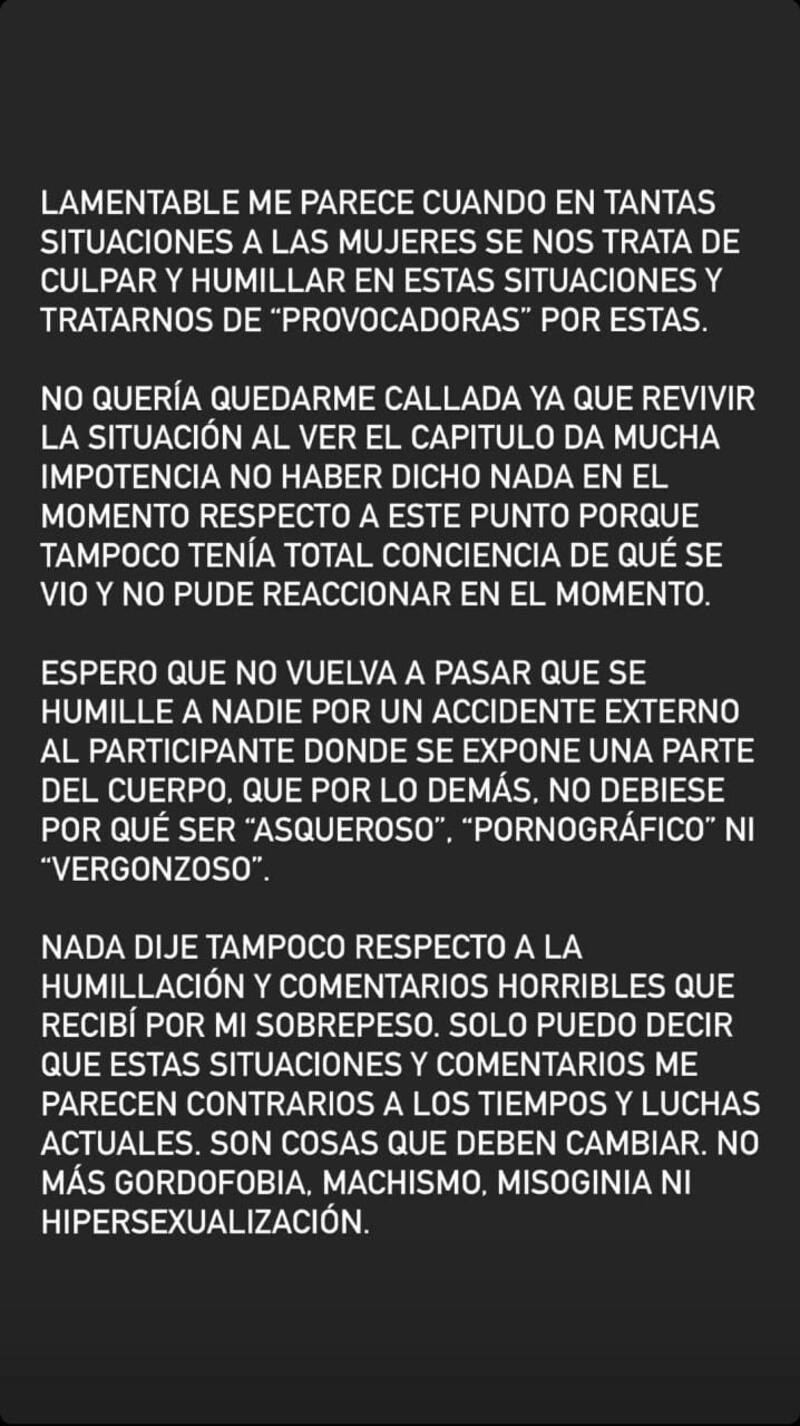 Luego que se divulgara en la noche del miércoles que la actriz era la nueva participante que debió dejar el espacio televisivo, esta no dudó en hacer sus descargos a través de sus redes sociales, acusando que las excesivas críticas hacia su cuerpo.