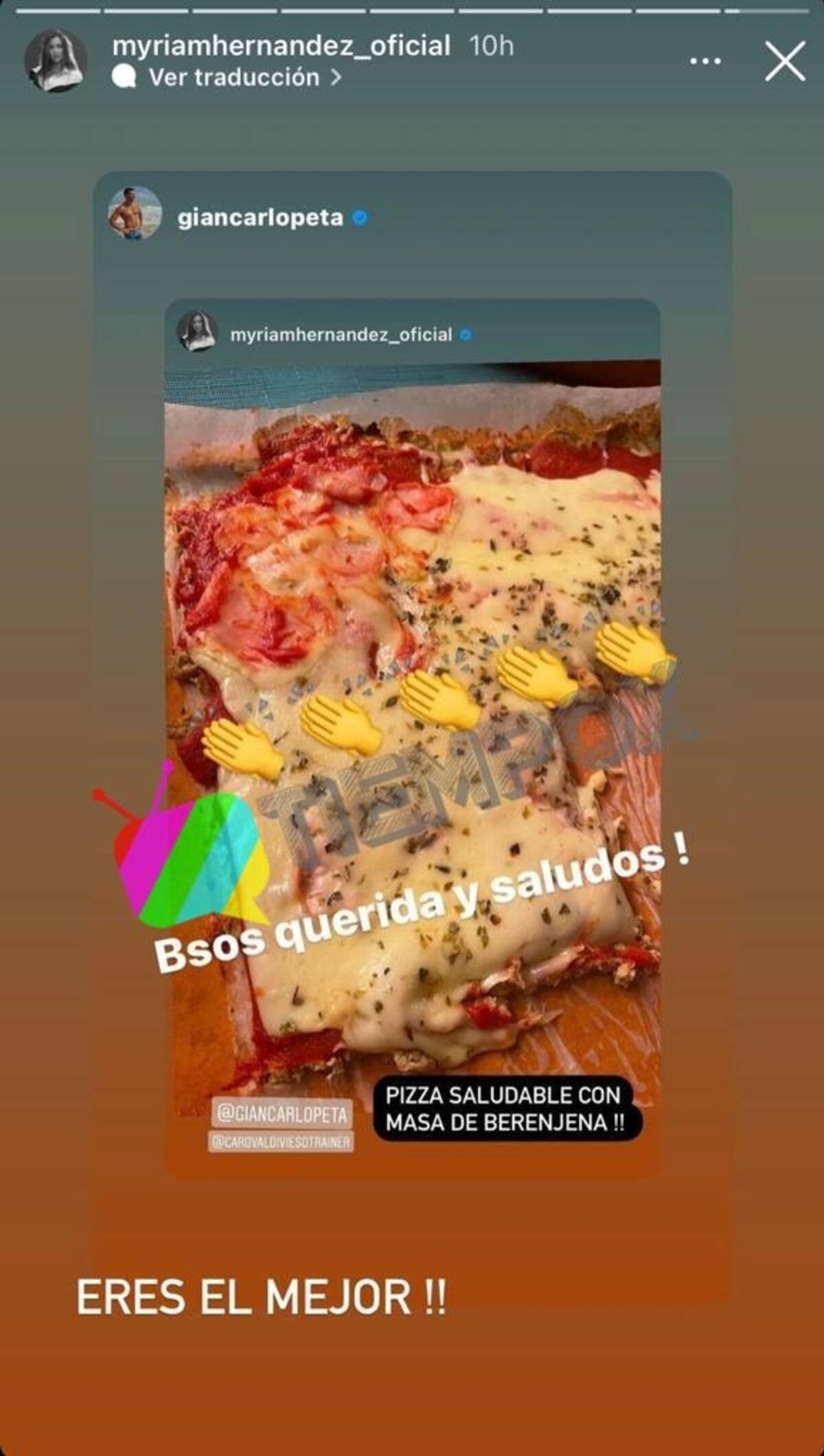 En la imagen, Myriam Hernández mostró que cocinó una pizza saludable con masa de berenjena, receta que le dio Giancarlo Petaccia. "Besos querida y saludos", le comentó el coach nutricional, quien constantemente ofrece asesorías en sus redes sociales.