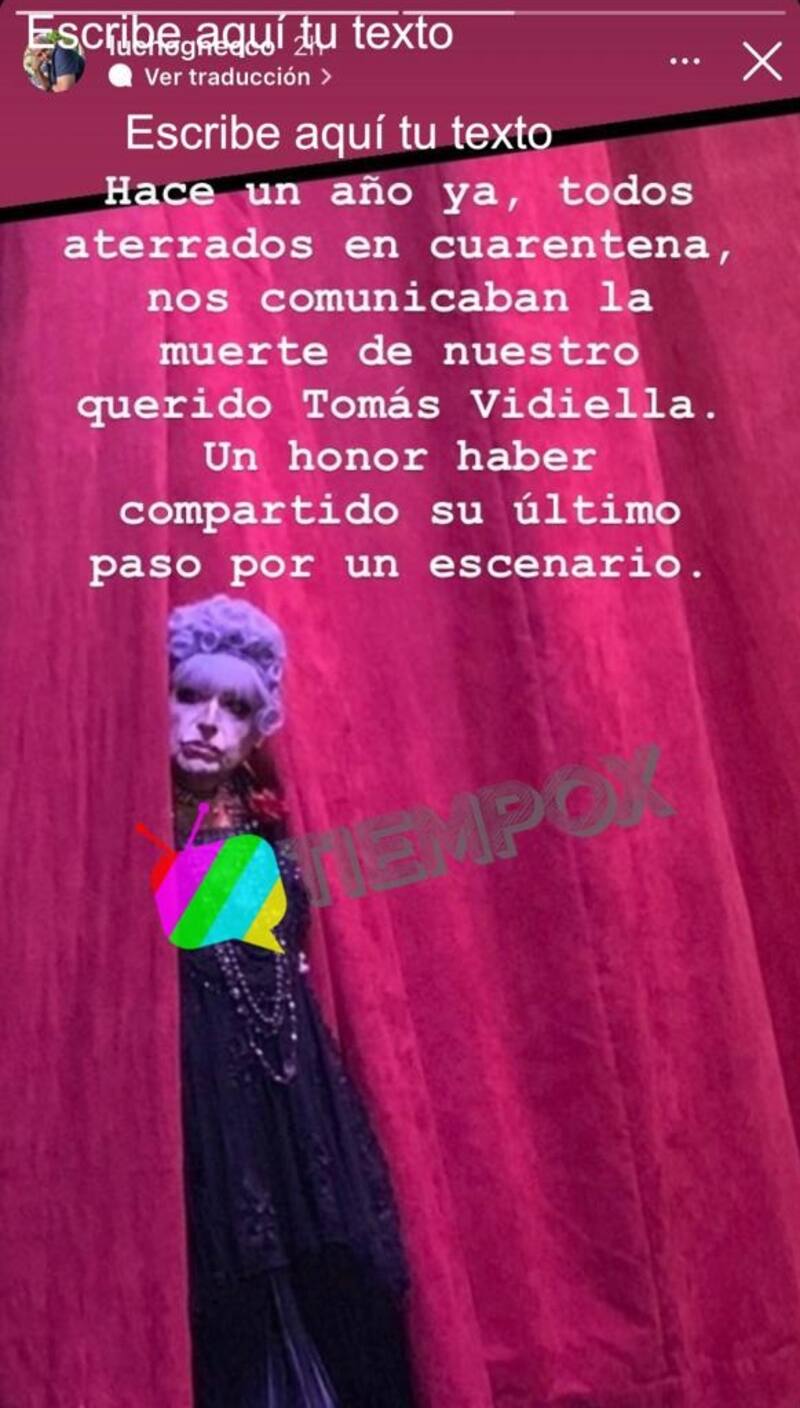 "Hace un año ya, todos aterrados en cuarentena, nos comunicaban la muerte de nuestro querido Tomás Vidiella. Un honor haber compartido su último paso por un escenario", expresó Luis Gnecco en sus historias de Instagram, junto a una emotiva foto del fallecido artista.