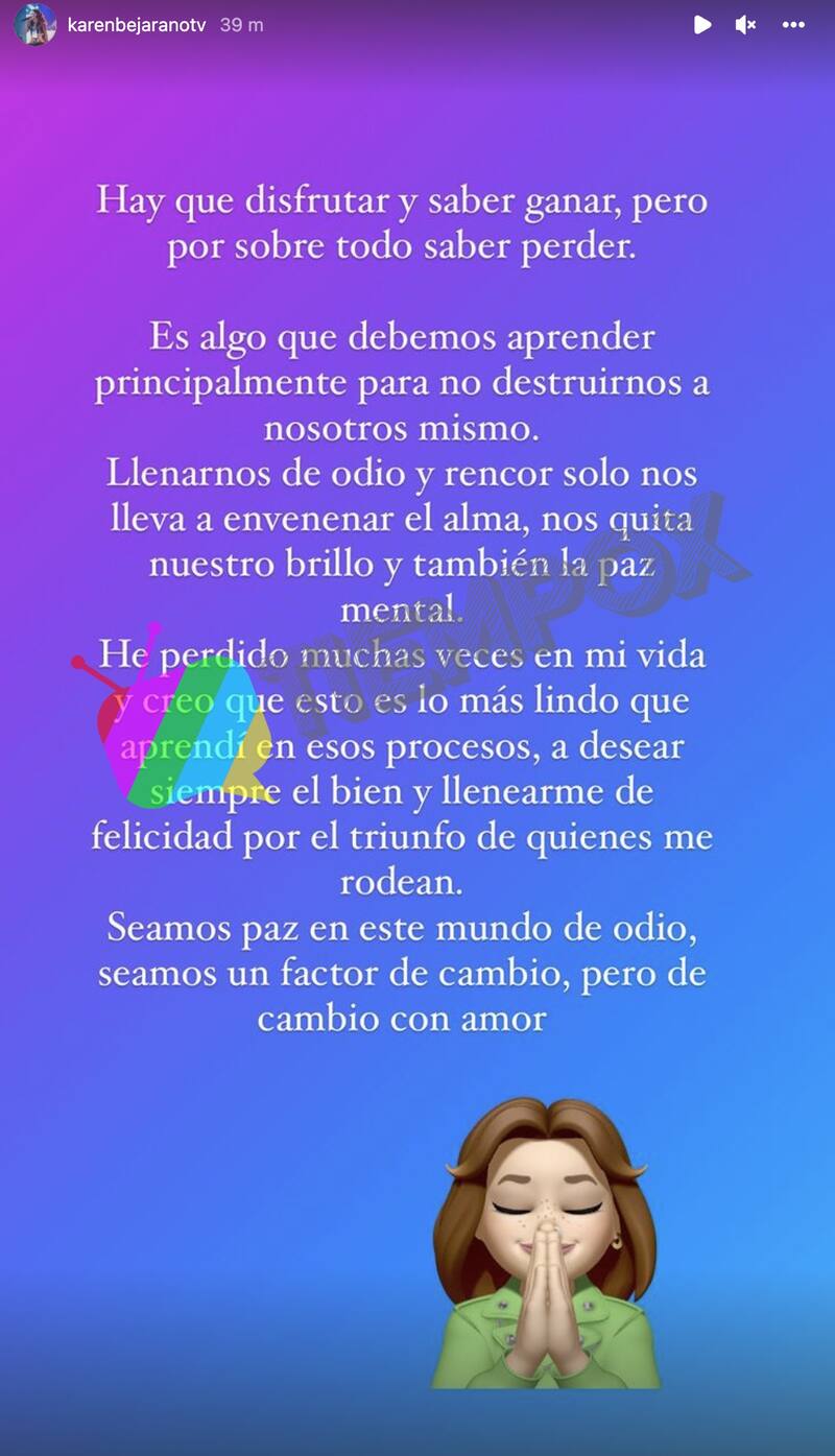 "He perdido muchas veces en mi vida y creo que esto es lo más lindo que aprendí de esos procesos: a desear siempre el bien y llenarme de felicidad por el triunfo de quienes me rodean", recalcó Karen Bejarano, sentenciando que es importante que "seamos paz en este mundo de odio, seamos un factor de cambio, pero cambio con amor".