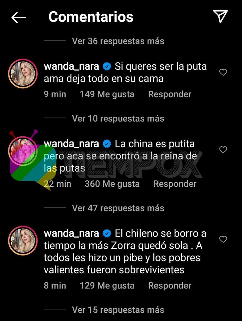El incidente se produjo cuando un usuario de Instagram hizo un comentario: "No pudo lograr su cometido la China, bien ahí". Desde su cuenta, Wanda Nara respondió: "Ese gato de la china solo sabe acostarse con casados. Mauro no es tonto por eso le contó a Wanda y dejo a la China como lo que es, un gato regalado".