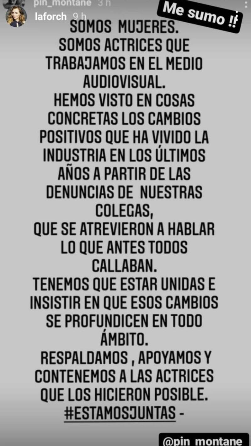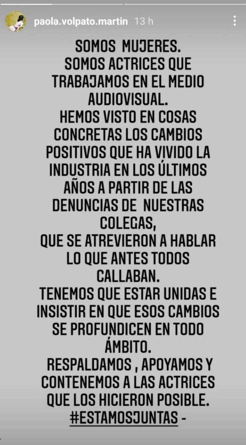 En sus respectivas historias de Instagram, las actrices publicaron el mismo comunicado, en el cual se lee: "Somos mujeres, somos actrices que trabajamos en el medio audiovisual. Hemos visto en cosas concretas los cambios positivos que ha vivido la industria en los últimos años a partir de las denuncias de nuestras colegas, que se atrevieron a hablar lo que antes todos callaban".