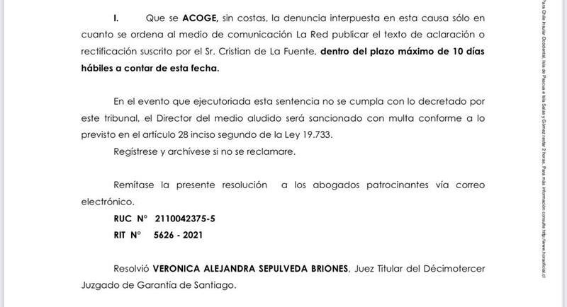 "Noticia que afectó gravemente mi honra y la de mi familia... En su sentencia el 13 Juzgado de Garantía ordenó a La Red publicar la nota de aclaración y rectificación, nota en la que se explica que no tengo ninguna relación con dicho caso, ni con el señor Parived", recalca en su comunicador el actor.