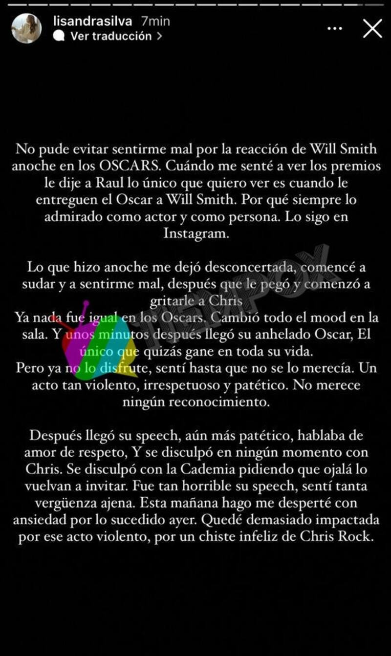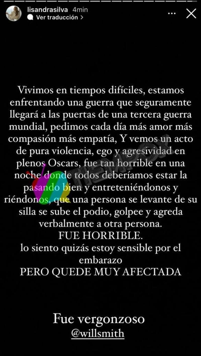 Sin embargo, nunca esperó que Will Smith reaccionaría de esta manera tras la cruel broma de Chris Rock. "Lo que hizo anoche me dejó desconcertada, comencé a sudar y a sentirme mal después que le pegó a Chris. Ya nada fue igual, cambió todo el mood en la sala. Unos minutos después llegó su anhelado Oscar, el único que quizás gane en su vida", comentó.