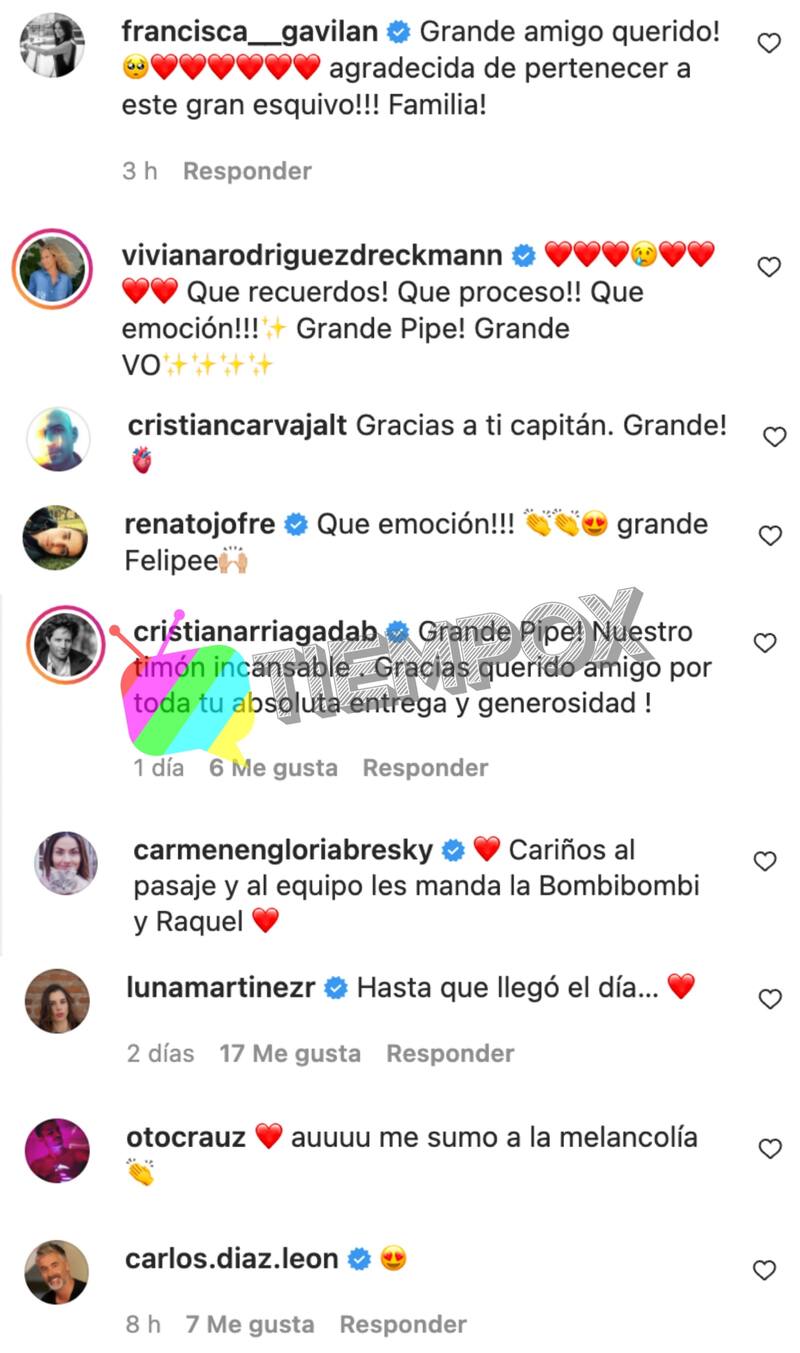 "Gracias a ti capitán. ¡Grande!", le señaló Cristián Carvajal; mientras que Renato Cofré, recordado por hacer el rol de Gonzalo, el hermano de Rocío, le expresó: "¡Que emoción! Grande Felipe".