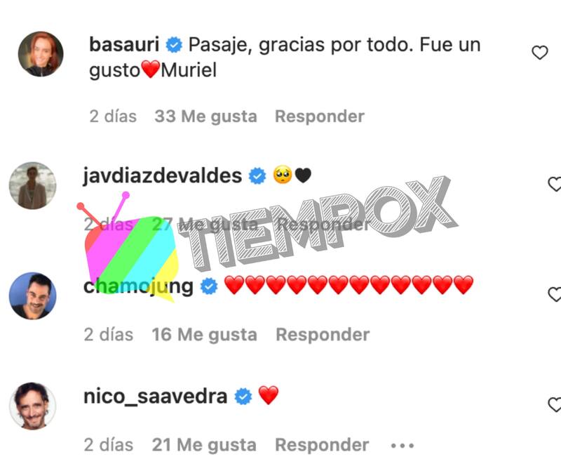 "Pasaje, gracias por todo. Fue un gusto, Muriel", aseguró Begoña Basauri, quien participó de "Verdades ocultas" hace unos años; mientras que Carmen Gloria Bresky, la cual llevó a cabo los roles de las gemelas Gladys y a Raquel, redactó: "Cariños al pasaje y al equipo les manda la Bombibombi y Raquel".