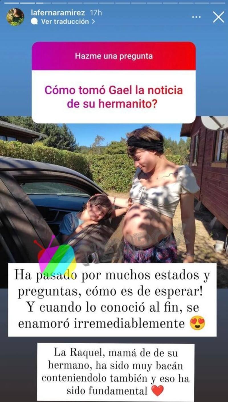 "La Raquel, mamá de su hermano, ha sido muy bacán conteniéndolo, también, y eso ha sido fundamental", agregó la actriz de "Pituca sin lucas" en sus historias de la red social, compartiendo una emotiva postal de Ortiz acaricando a Gael, mientras luce su pancita de embarazo.