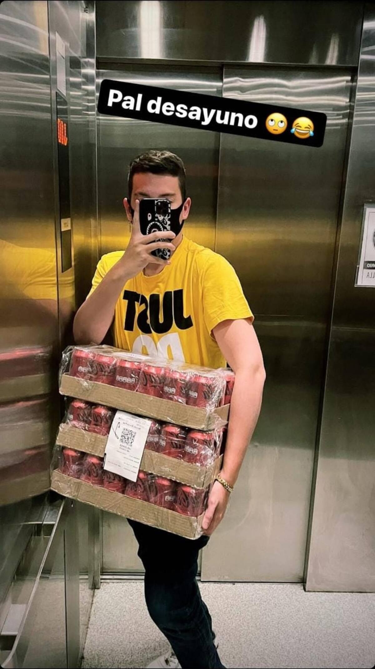 "Pal desayuno", escribió brevemente Nano Calderón en su cuenta de Instagram, todo esto mientras se tomaba una fotografía en el ascensor con la bebida.