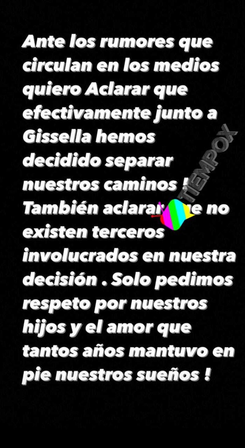 Asimismo, este agregó que "también quiero aclarar que no existen terceros involucrados en nuestra decisión. Solo pedimos respeto por nuestros hijos y el amor que tantos años mantuvo en pie nuestros sueños".