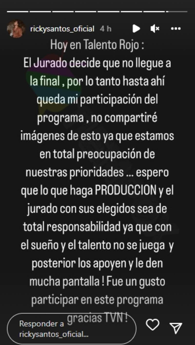 Así, Ricky Santos adelantó a sus seguidores de Instagram que hoy será eliminado del programa, lanzando una crítica hacia "Talento Rojo".