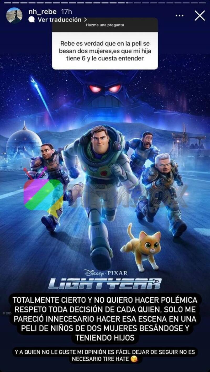 Es así que Rebeca Naranjo respondió algunas preguntas de sus seguidores en sus historias de Instagram. Una de dichas inquietudes decía: "¿Es verdad que en la peli se besan dos mujeres? Es que mi hija tiene seis y le cuesta entender".