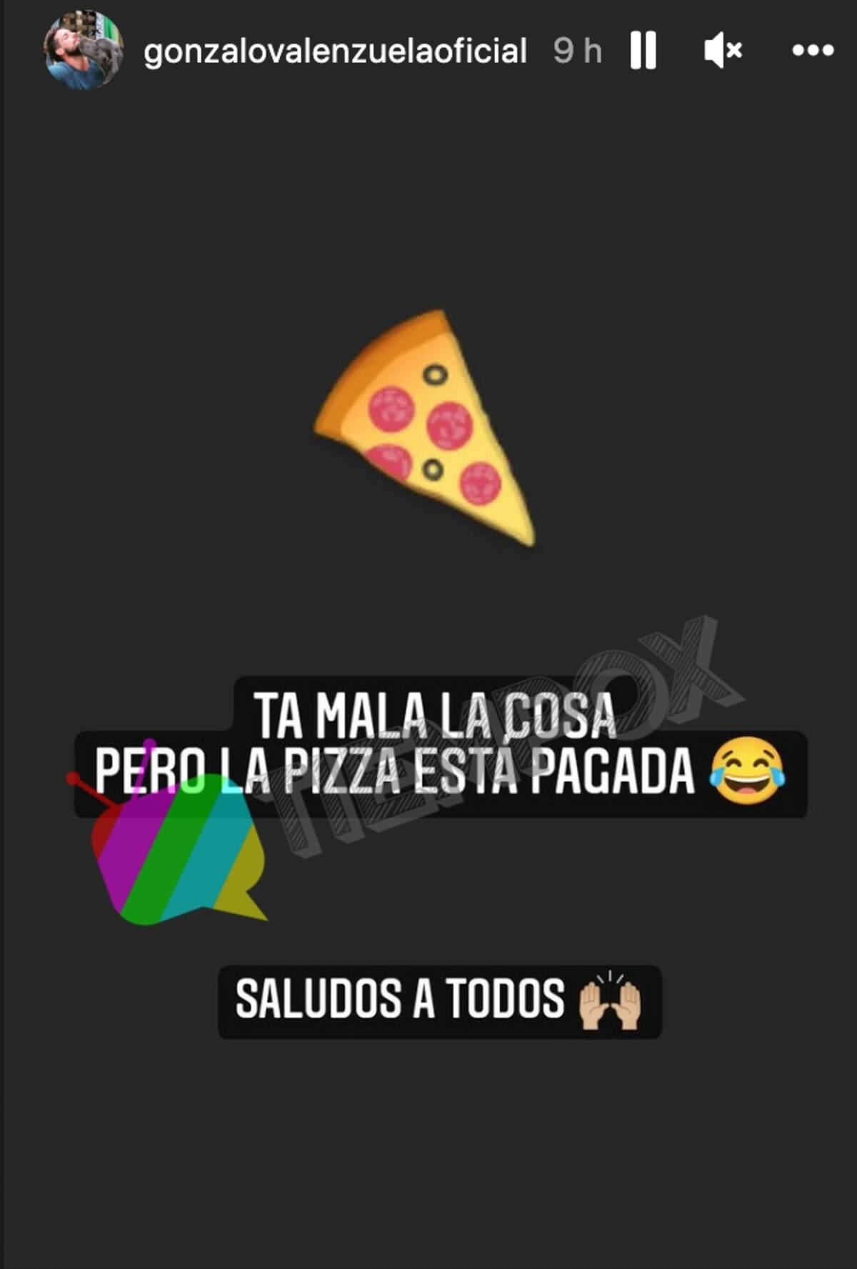 En sus historias de Instagram, Gonzalo Valenzuela compartió un escueto mensaje junto a un gran emoji de pizza y uno de risa. Este decía: "Ta' (sic) mala la cosa, pero la pizza está pagada".