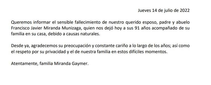 Mira acá el comunicado de la familia de Javier Miranda por la muerte del comunicador
