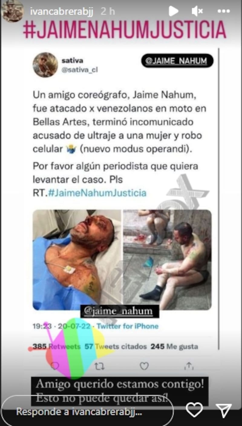 "Un amigo coreógrafo, Jaime Nahum, fue atacado por venezolanos en moto en Bellas Artes, terminó incomunicado acusado de ultraje a una mujer y robo celular (nuevo modus operandi)" publicó un amigo del coreógrafo en Twitter.