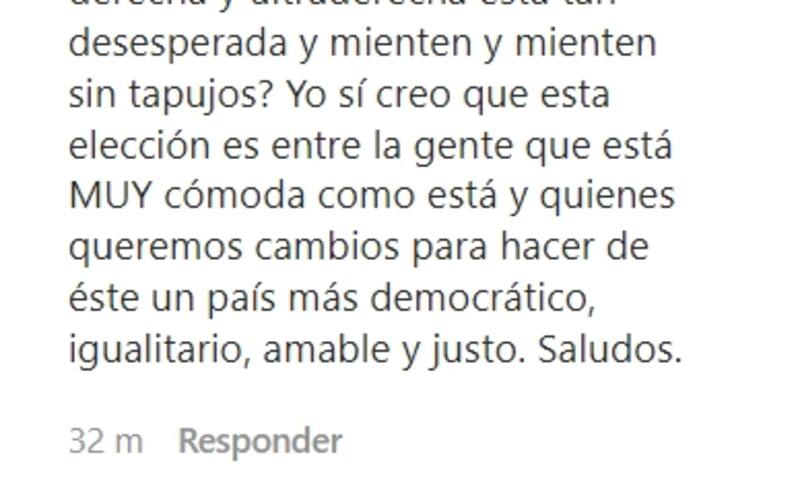 De esta manera la actriz de "Rara", quien toma partido por el Apruebo, comentó en la publicación, criticando a su colega: "Faltas a la verdad Pablo. No es cierto que la propuesta constitucional señale el término del Poder Judicial, no señala que hay más valor en unos votos u otros por los escaños reservados. ¿Por qué hablan de paz? ¿Crees que el rechazo traerá paz a este país?"