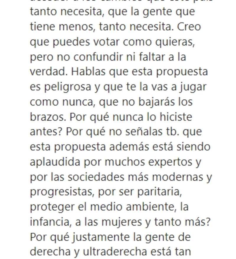 "¿Por qué no señalas también. que esta propuesta además está siendo aplaudida por muchos expertos y por las sociedades más modernas y progresistas, por ser paritaria, proteger el medio ambiente, la infancia, a las mujeres y tanto más. ¿Por qué justamente la gente de derecha y ultraderecha está tan desesperada y mienten y mienten sin tapujos?", agregó.