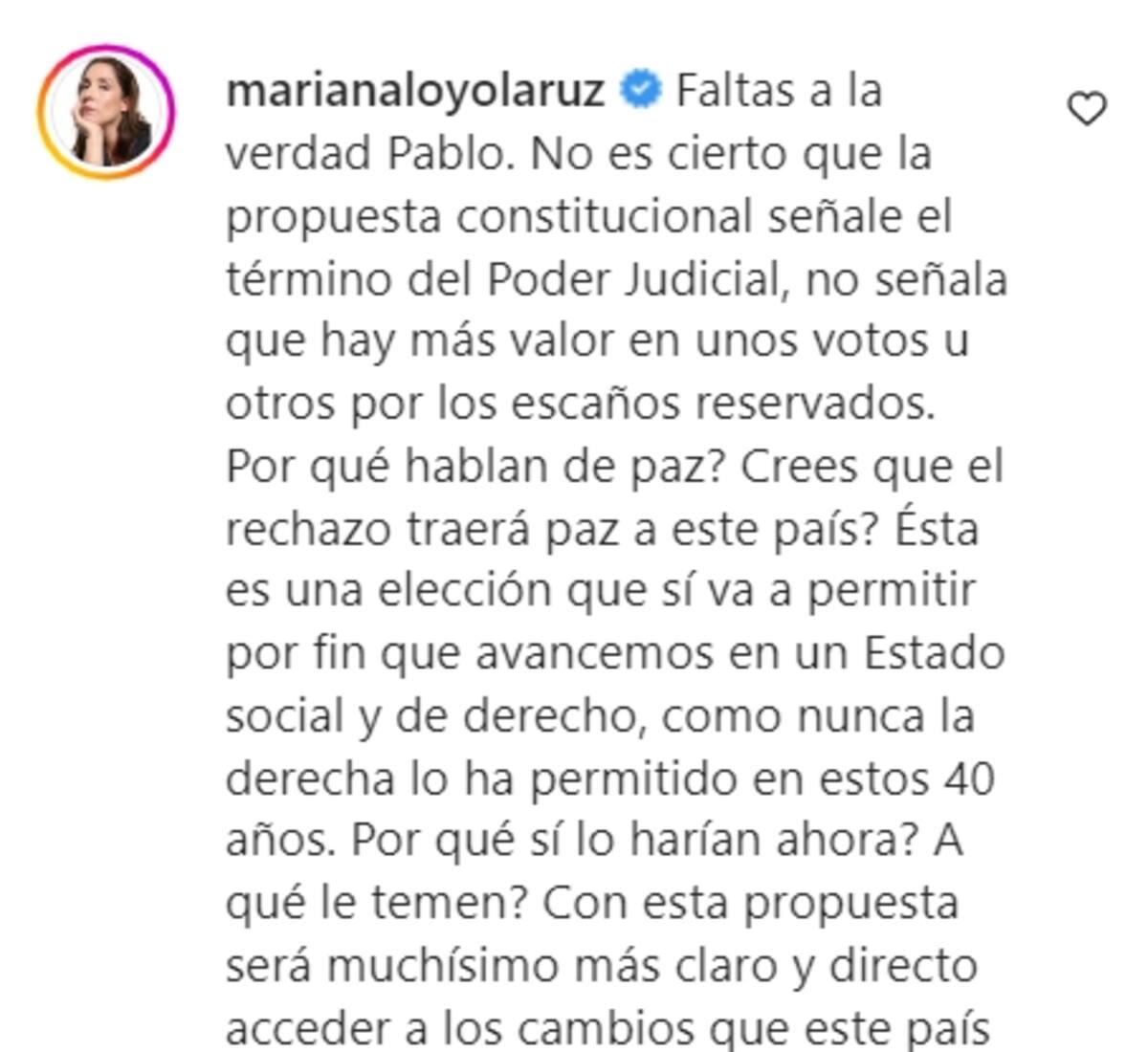 De esta manera la actriz de "Rara", quien toma partido por el Apruebo, comentó en la publicación, criticando a su colega: "Faltas a la verdad Pablo. No es cierto que la propuesta constitucional señale el término del Poder Judicial, no señala que hay más valor en unos votos u otros por los escaños reservados. ¿Por qué hablan de paz? ¿Crees que el rechazo traerá paz a este país?"