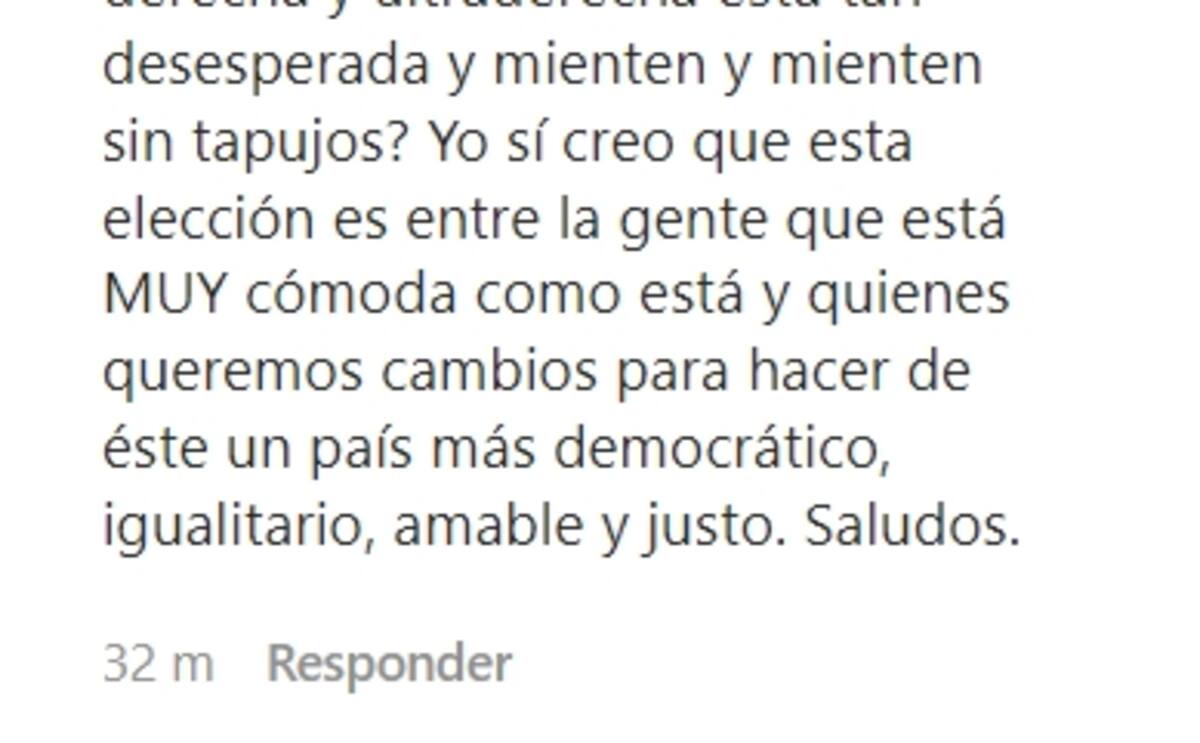 "¿Por qué no señalas también. que esta propuesta además está siendo aplaudida por muchos expertos y por las sociedades más modernas y progresistas, por ser paritaria, proteger el medio ambiente, la infancia, a las mujeres y tanto más. ¿Por qué justamente la gente de derecha y ultraderecha está tan desesperada y mienten y mienten sin tapujos?", agregó.