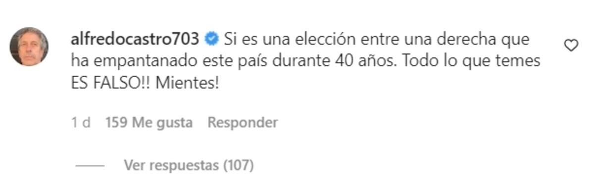 Tras la publicación del video, las reacciones y comentarios no se hicieron esperar. Uno de ellos provino del destacado actor Alfredo Castro, quien refutó las palabras de su colega expresando: "Si es una elección entre una derecha que ha empantanado este país durante 40 años. ¡Todo lo que temes es falso! ¡Mientes!".