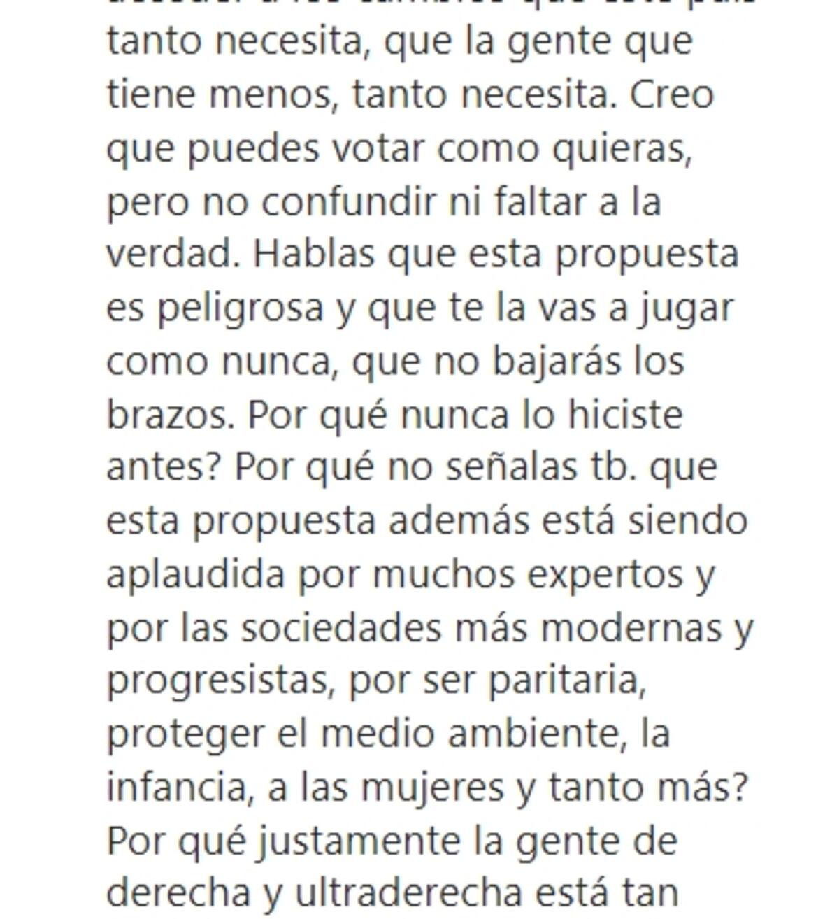 Finalmente la actriz cerró expresando: "Creo que puedes votar como quieras, pero no confundir ni faltar a la verdad. Hablas que esta propuesta es peligrosa y que te la vas a jugar como nunca, que no bajarás los brazos. ¿Por qué nunca lo hiciste antes?"