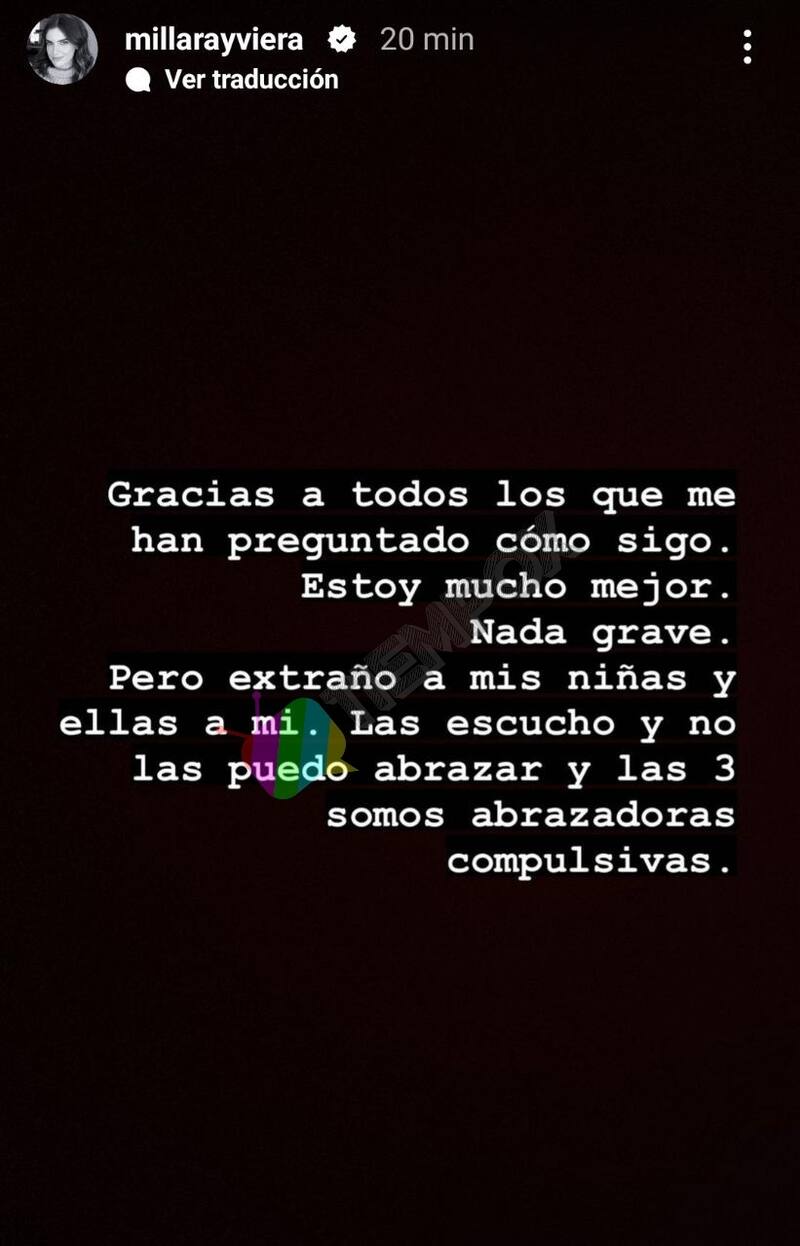 En medio de su reflexión, Millaray Viera agradeció a todos sus fieles seguidores por las palabras de apoyo que ha recibido: "Gracias a todos los que me han preguntado cómo sigo. Estoy mucho mejor, nada grave".