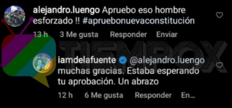 "No sé, pero te aviso. Gracias por tu preocupación", señaló Cristián de la Fuente, para luego responder a una persona que hizo un pequeño juego de palabras con el Apruebo: "Muchas gracias, estaba esperando tu aprobación. Un abrazo".