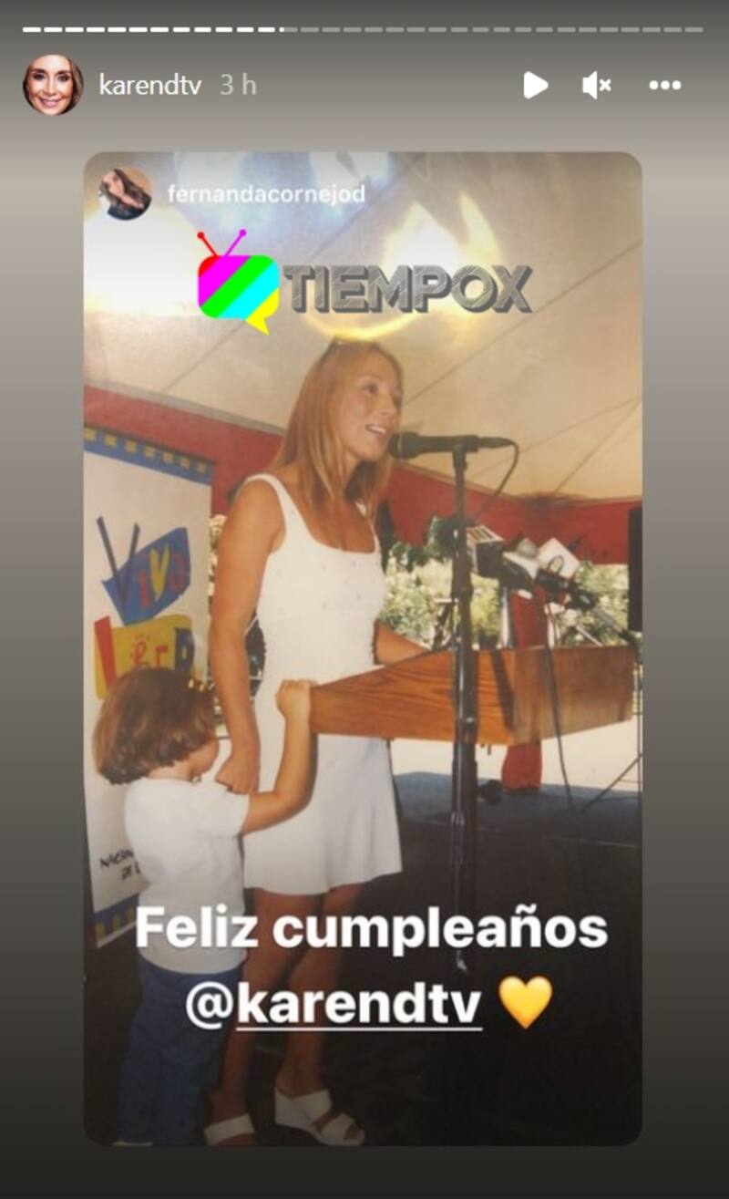 Tal como dio a conocer en horas de esta jornada Karen Doggenweiler a través de sus redes sociales, destaca un especial saludo de la mayor de sus hijas, Fernanda Cornejo -fruto de su disuelta relación con el periodista Eugenio Cornejo- quien compartió en sus redes sociales una bella fotografía del baúl de los recuerdos, donde se ve a la animadora en un evento hablando hacia el público, mientras ella la acompaña a su lado.